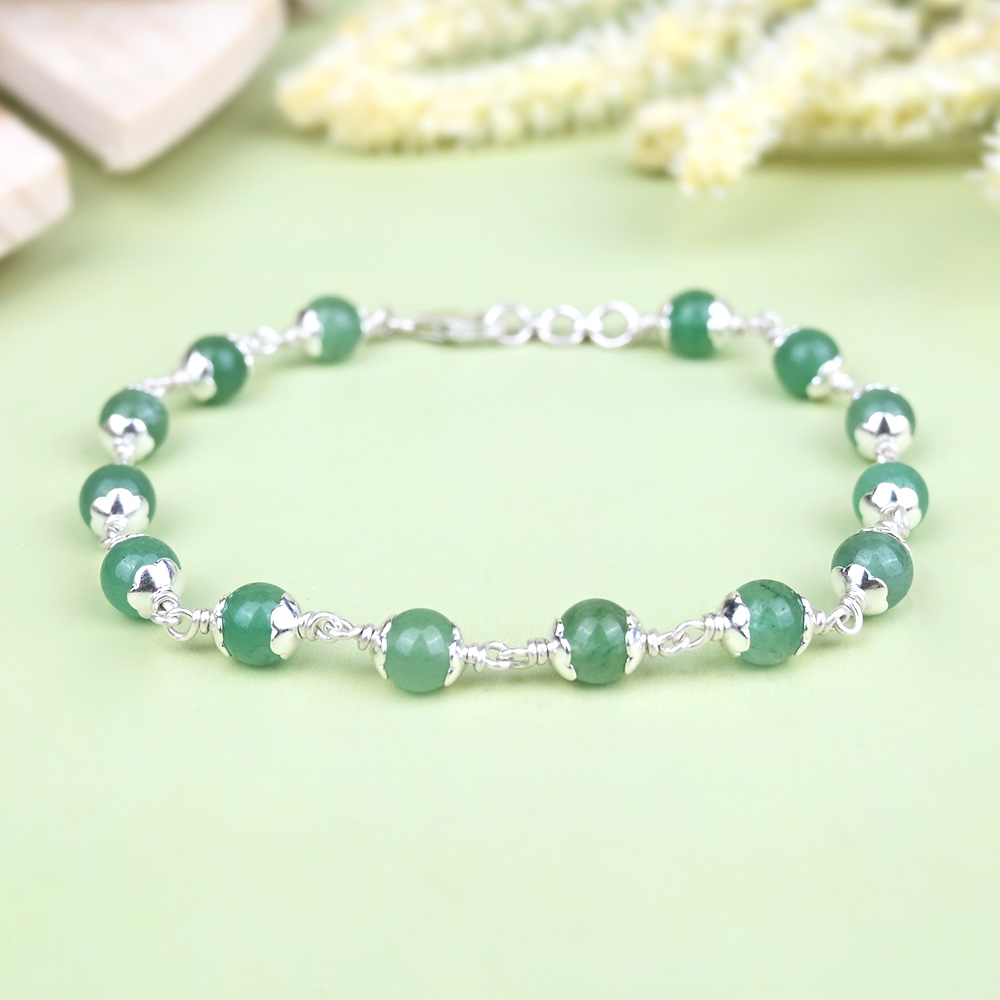 This delicate bracelet features round Green Aventurine beads adorned with finely crafted 925 silver flower caps on each end, adding a soft, floral elegance to the deep green hues of the stone. Each bead is individually linked with sterling silver wire, and the bracelet is secured with a lobster clasp and extension links for adjustable sizing. The simple yet refined design offers both aesthetic charm and spiritual grounding, ideal for everyday healing wear. Green Aventurine gently supports emotional healing, invites abundance, and nurtures the Heart Chakra for renewed growth.