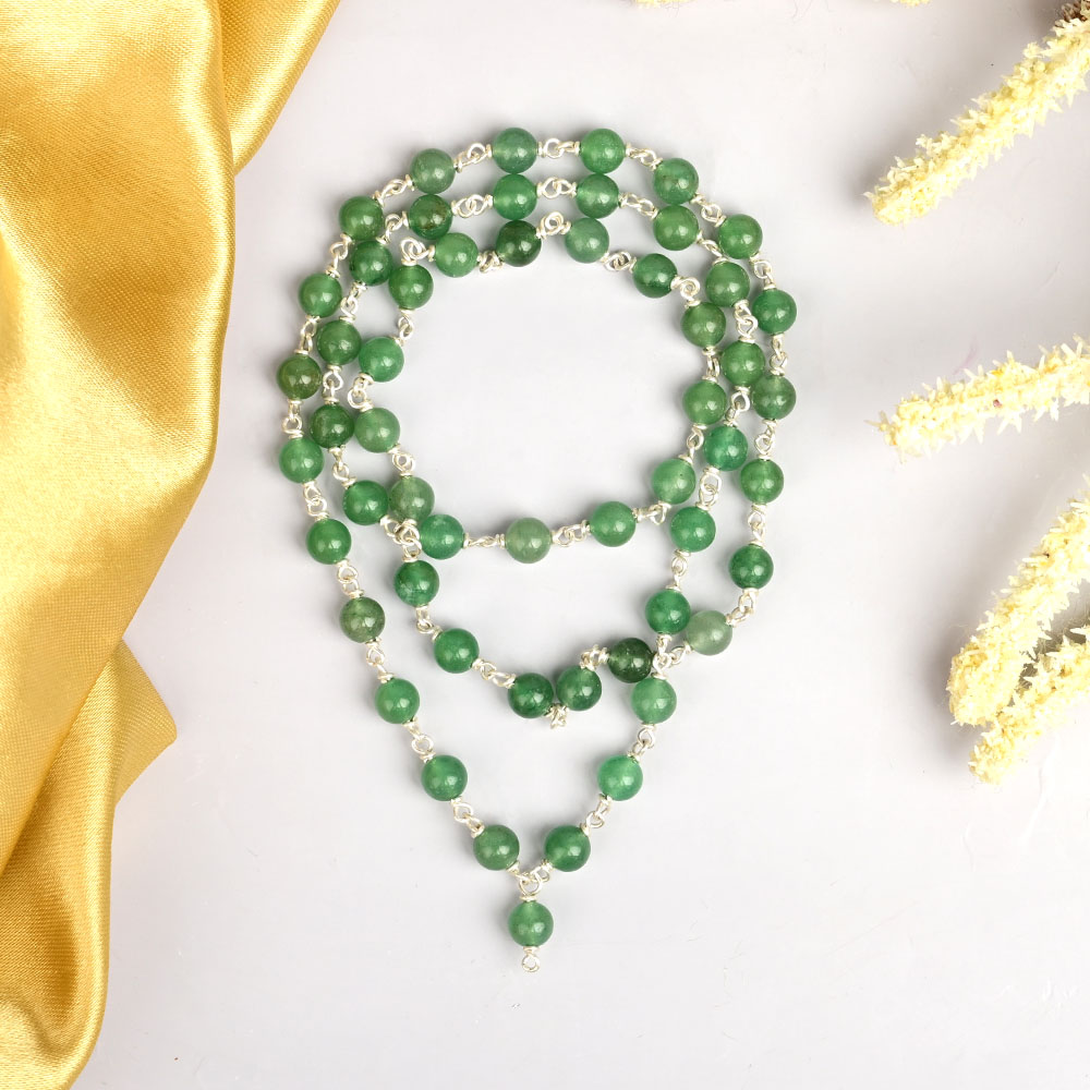 This exquisite mala is crafted using genuine green aventurine beads linked together with 92.5% pure silver wire, offering both elegance and durability. Each round bead is carefully selected for its vibrant green tone and natural clarity, then skilfully hand-wired in sterling silver to create a seamless flow of energy. The silver links add a refined touch, enhancing both the aesthetic and spiritual vibration of the mala. Lightweight yet sturdy, it can be worn as a statement accessory or used during mantra chanting.