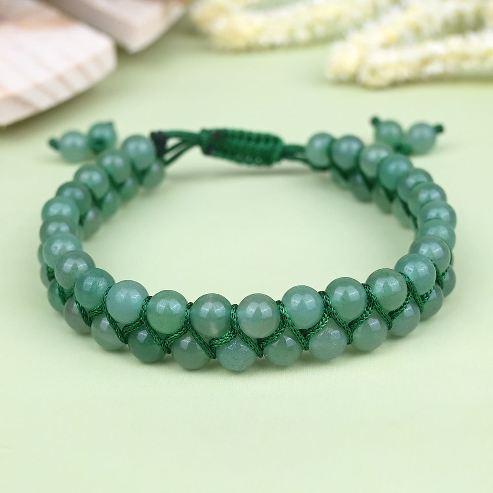 This bracelet is handcrafted with smooth, round Green Aventurine beads, carefully strung together in a stylish double-layered design. The beads are polished to a glossy finish, reflecting subtle shades of soothing green that symbolize freshness and vitality. The adjustable woven cord not only ensures durability but also allows a perfect fit for all wrist sizes. With its rich green tones and neatly knotted detailing, the bracelet carries a refined yet natural charm, making it a versatile accessory for both casual and elegant wear. Green Aventurine is known as the "Stone of Opportunity" and is believed to attract prosperity, luck, and abundance. It promotes emotional balance, calming the mind while releasing negative thoughts and stress. Spiritually, it enhances optimism and helps open the heart chakra, encouraging compassion and harmony in relationships. On a healing level, Green Aventurine is said to support heart health, boost vitality, and aid in overall well-being. Wearing this bracelet daily can help you stay grounded, positive, and aligned with the flow of abundance.