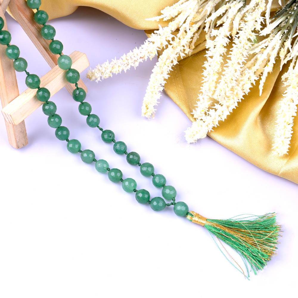 This mala features smooth, polished round beads of uniform size in a rich, translucent green shade. Each bead showcases the natural sheen and calming hue of Green Aventurine. The beads are individually knotted for durability and ease of mantra counting during japa practice. Finished with a soft green tassel that adds a traditional touch and enhances its spiritual appeal. Crafted from natural Green Aventurine, revered as the stone of opportunity, healing, and heart-centred growth. Benefits Brings luck, emotional healing, and clarity of heart in decisions and relationships. Enhances compassion, attracts abundance, and promotes a calm, balanced state of mind.