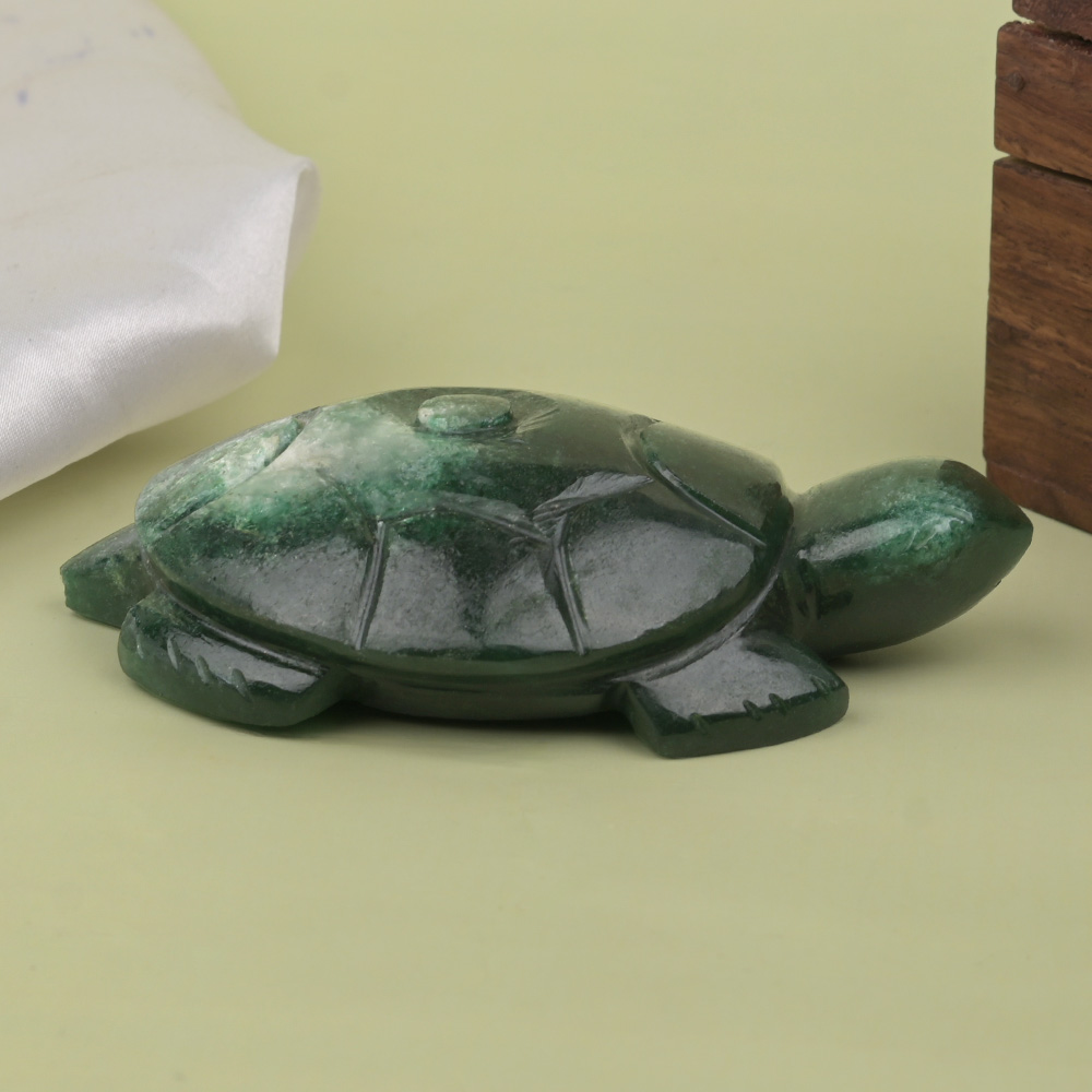 A Kurma (Tortoise) carved with precision from natural Green Jade Gemstone, is kept at home or office, work table, Living room as an harbinger of good luck, auspiciousness, success, prosperity. Kurma is the second Avatar of Lord Vishnu, who offered His back as the base of the churning stick during the Celestial Samudra Manthan. Legend has it, that Shani Dev(Lord Saturn) had granted a boon to Kurma Avatar, that anyone who worships Him will get relief from malefic effects of Planet Saturn.