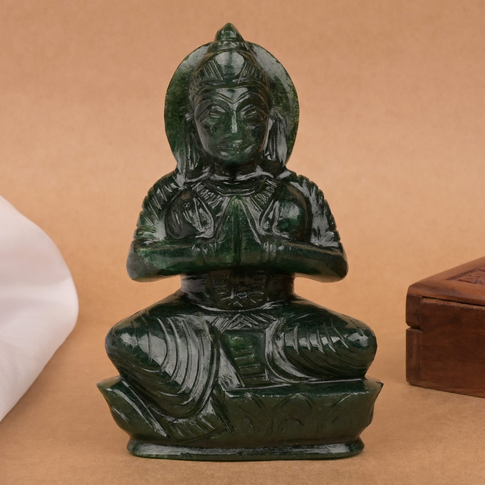 This charming idol with clear radiance features Goddess Parvati doing Tapa made in Green Aventurine. Goddess Parvati is portrayed seated in Sukhasana, the meditative pose and clad in sari and adorning a crown on Her head. Her palms are joined together in Namaskar pose. Goddess Parvati performed Tapa(penance) for several years to obtain Lord Shiva as Her consort. She observed strict penance with determination consuming very little food. Parvati in this form signifies strong determination, loyalty, focus, love, knowledge and wisdom. Worshipping Goddess in this form bestows growth in spiritual quests, focus, determination, strength of perseverance in one's duties regardless of obstacles, confidence, wisdom, victory, patience and success under all circumstances.