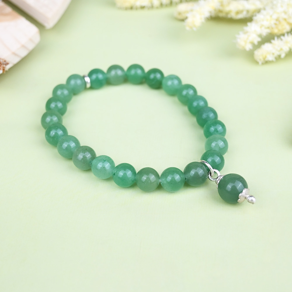 This Green Aventurine Bracelet is crafted with smooth, polished green Aventurine beads, displaying a natural, soothing green hue. The bracelet features a hanging bead capped in fancy metal elegantly dangling to add a refined touch. Strung securely on an elastic band, it ensures a comfortable and flexible fit for daily wear. Benefits: Attracts luck, prosperity, and opportunities in career and personal life. Promotes emotional healing and stress relief, bringing inner balance. Enhances heart chakra energy, fostering love, compassion, and harmony.