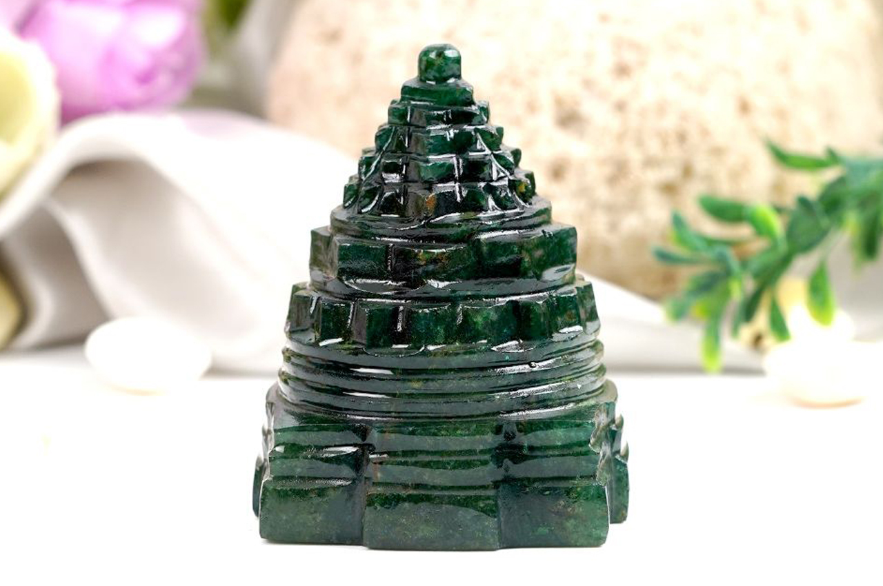 Shree Yantra with fine geometry is perfectly etched in pyramidal form on natural green Jade gemstone. The Yantra features sacred geometry of steps in form of Bhupura leading to concurring chakra (circles) and 16 and 8 petal lotuses ascending to multiple triangular steps finally leading to focal point for convergence of soul with divine Goddess Lalita. Shree Yantra also called Sri Chakra is a very powerful and auspicious Yantra. Its sacred geometry symbolizes the divine energies of Goddess Tripura Sundari and carries the potency and blessings of all Gods and Goddess. It is also the cosmic representation of the evolution of human to God; hence helps achieve growth and success in all realms of life. Made in Green Jade, it promotes love, trust, reliability, peace, protection and tranquillity through the cleansing properties of the gemstone.