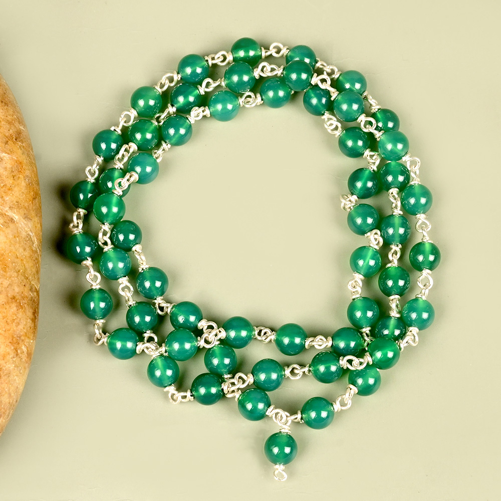 This mala is made with smooth, polished green onyx beads, each carefully hand-linked with durable 925 sterling silver wire for a seamless and elegant finish. The fine craftsmanship ensures both strength and fluid movement, making it ideal for daily wear or spiritual practice.