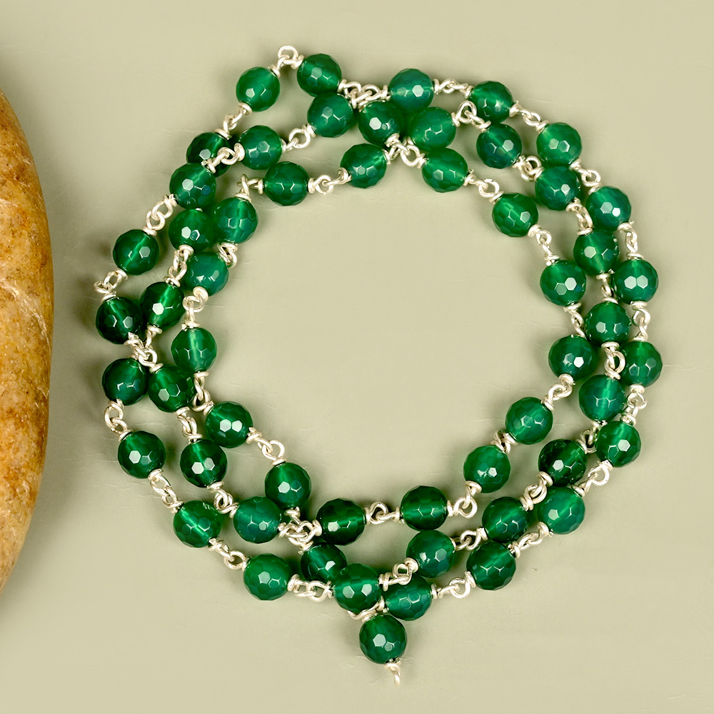This mala is crafted with smooth, round faceted Green Onyx beads, each skilfully linked with 925 sterling silver wire for durability and elegance. The uniform green beads display a rich, deep tone with a subtle shine from the faceted surface, enhancing their natural beauty. The meticulous silver wire wrapping between each bead adds flexibility and strength, making it suitable for daily wear or spiritual practices.