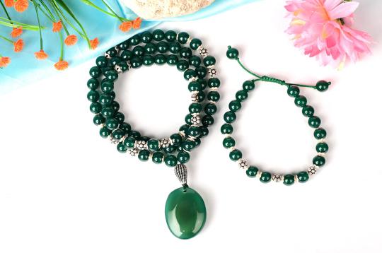 In addition, Green Onyx stone promotes self love, improves communication, quality of speech, creative abilities, it clears the negative energies in the aura of the wearer, bestows good health and enhances intuitive powers, which add to the benefits of wearing this Mala and Bracelet set.
