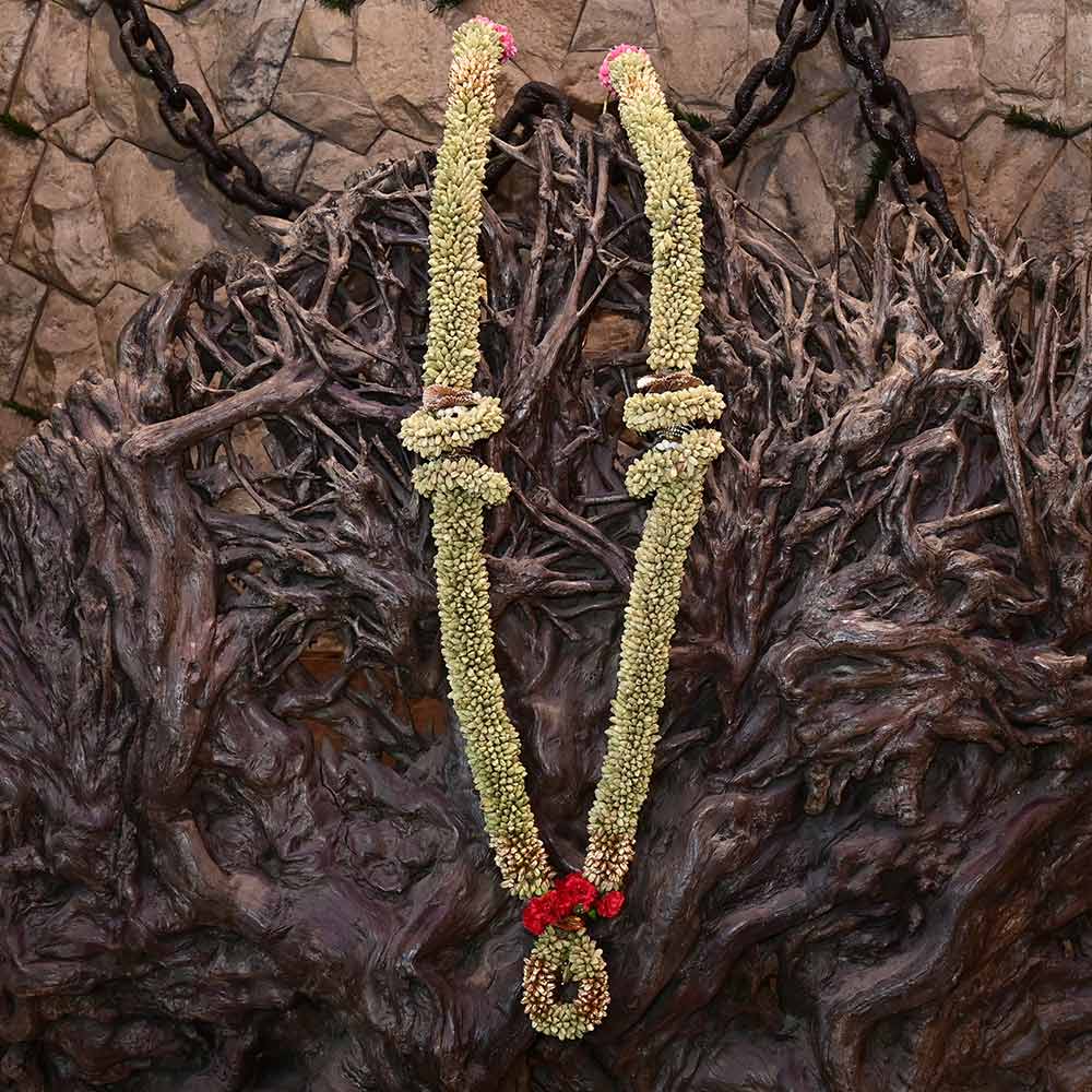This Handcrafted Elaichi Cardamom Deity Garland Mala is made from aromatic cardamom pods and is designed for adorning deities during pujas. The garland, weighing 2.2 kgs, symbolizes devotion, respect, and purity, serving as a sacred offering to the divine.