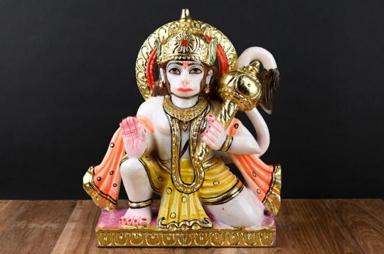 Beautiful idol of Lord Hanuman made in marble and hand painted with lasting colors to adorn and add fervor to your Puja altar. The idol is hand-crafted by artisans. In the idol Lord Hanuman is depicted in one of His popular poses, kneeling on one knee and blessing His devotees. One hand of His is holding mace and the other is in a blessing mudra. The idol is adorned with jewels, crown and other embellishments. Lord Hanuman is a symbol of devotion, strength, and courage. He is also considered as an epitome of knowledge and wisdom. The most ardent devotee of Lord Rama, He is an incarnation of Lord Shiva. Lord Hanuman is widely revered and worshiped as a powerful protector and one who blesses His devotees with good health, success and prosperity. Marble is one of the most popular materials for Deity idols because of their durability and resistant to weathering. Marble idols, statues and sculptures have been created for thousands of years. Marble idols are widely used in Hindu temples and also at homes to be worshiped as Deity idols as marble is considered as pure and best material for God and Goddess Idols.