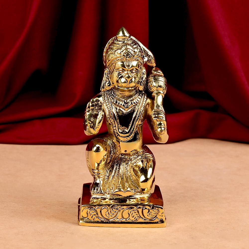 An idol of Bhagwan Hanuman in His Veermurti form, artistically crafted in shining brass, portrayed kneeling on a traditionally designed dais with the right hand raised in Abhaya Mudra offering assurance of protection and the left holding the mace signifying immense strength and bravery. Adorned with a crown, jewels, and tilak, this form symbolizes courage, valour, and fearlessness, and is traditionally worshipped to overcome black magic, possessions, and sufferings due to the malefic effects of Mars and Saturn.