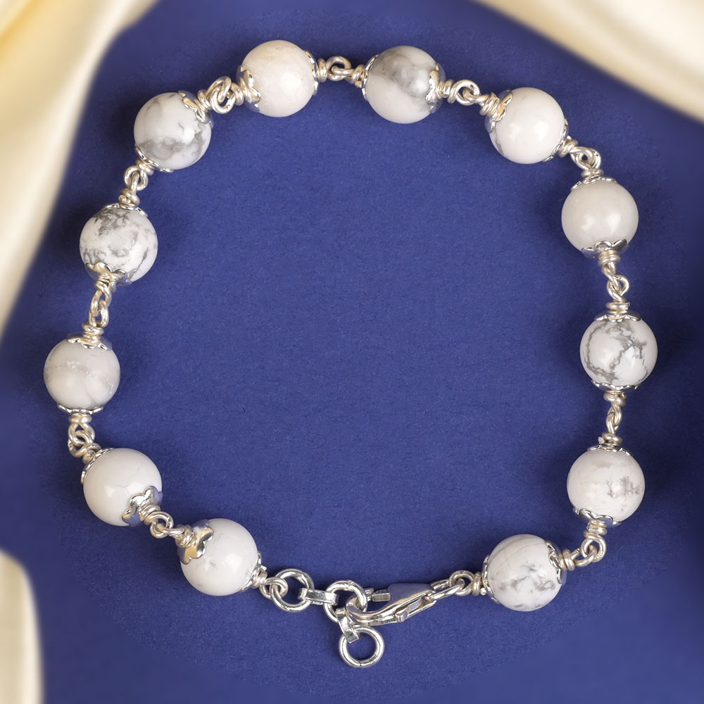 This elegant Howlite 925 Silver Flower Caps Bracelet is crafted from smooth, round natural White Howlite beads, each adorned with intricately designed 925 sterling silver flower caps that enhance the bracelet’s refined and timeless beauty. The contrast between the soft white stones with their natural grey marbling and the bright silver detailing creates a look of understated sophistication. The bracelet is strung on a strong elastic or wire base for a comfortable and durable fit, making it suitable for both daily wear and special occasions. Howlite is revered as a stone of tranquility, awareness, and emotional balance. It helps calm an overactive mind, eases anxiety, and promotes restful sleep. Wearing this bracelet encourages patience, inner peace, and mindfulness, making it an excellent companion during meditation or stressful situations. The sterling silver elements not only enhance its aesthetic charm but also carry purifying and protective energies, amplifying the bracelet’s spiritual benefits. Ideal for those seeking serenity, clarity, and harmony in their lives, this bracelet supports emotional healing and personal growth. The Howlite 925 Silver Flower Caps Bracelet blends the soothing energy of Howlite with the purity of silver, creating a graceful accessory that nurtures calmness, focus, and spiritual well-being.