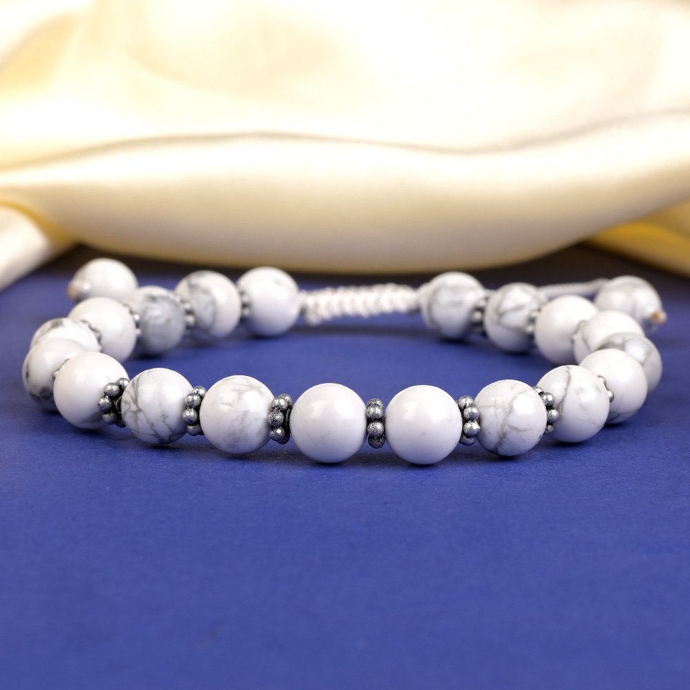 This stylish Howlite bracelet features smooth white Howlite beads accented with silver chakri spacers between each bead, and adjustable ends for a comfortable, customized fit. The combination of serene white tones and silver detailing creates a look of timeless elegance and balance.