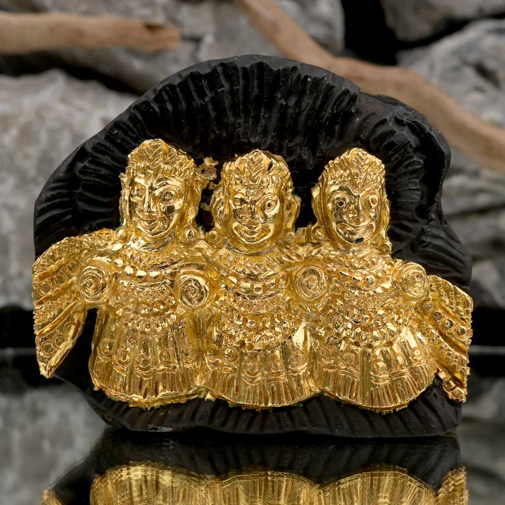 A Divine Jagannath Puri Shaligram Murti carved on natural Shaligram stone with long lasting Gold plating which Highlights the Idol. The Murti is carved dexterously with the images of Lord Jagannath, Devi Subhadra and Lord Balabhadra, as is seen in Jagannath Temple at Puri. Lord Balabhadra is the brother of Lord Jagannath and Devi Subhadra is His sister. Lord Jagannath is a form of Lord Vishnu/Krishna. The Shaligram stone is considered sacred as it is the abode of Lord Vishnu. Found in its natural form in the beds and banks of Kali Gandaki River, Nepal, each Shaligram has the natural Sudarshan Chakra marking on it and ardently worshipped. Keeping the Shaligram stone at home removes Vastu Doshas, it emits positive vibration and shields the place from harmful energies.