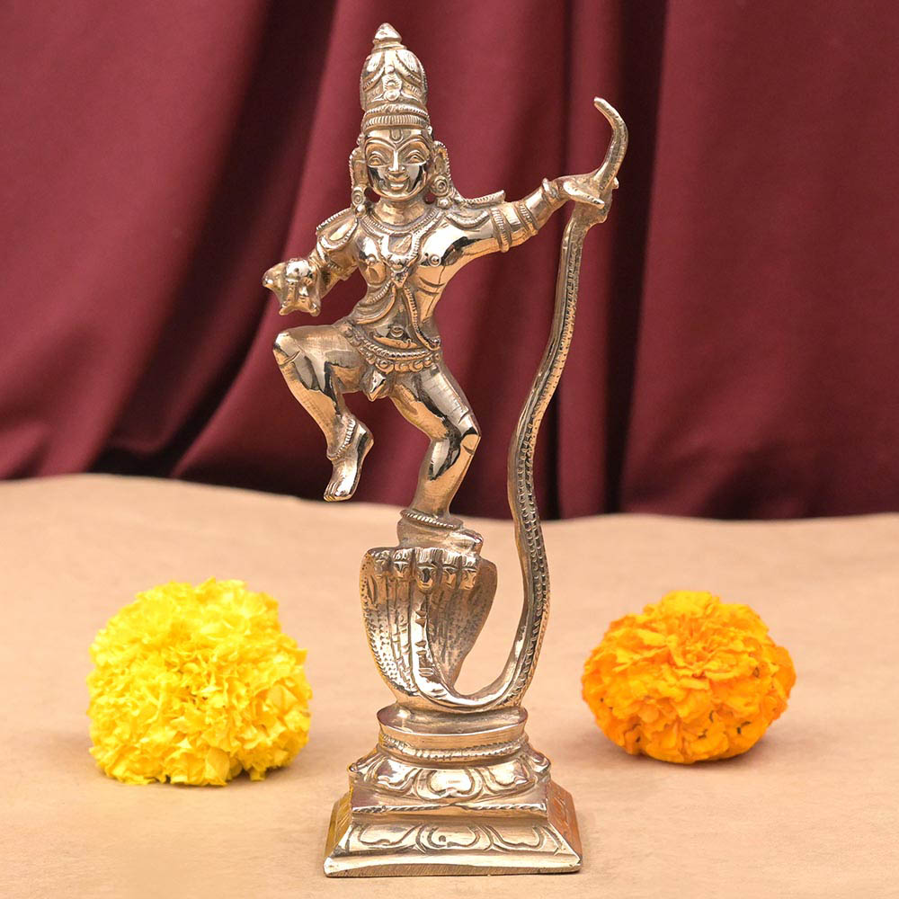 The blissful idol of Lord Krishna gracefully standing on Kaliya serpent with one hand in blessing pose is beautifully designed in bronze. Crafted in South India style, this beautiful Idol looks beautiful with rich carving and brilliant shine. Signifying Lord Krishna's power of protecting his devotees and defeating the evil in a skillful playful manner, the Idol would enhance the protection energies in your abode.