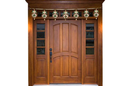 Kalash Bandarwar is made with Kalash hangings decorated with golden and other colored beads and Om and Lord Ganesha face. Bandarwars or torans (door hanging) are used to adorn the main entrance door of the house or the door of the Puja room to invite prosperity.