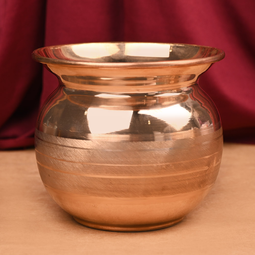 A traditional kalash made in copper. Kalash is the most fundamental part of the daily pooja. This is meant to hold water during religious rituals. It may also be placed with due rituals on all important occasions like the traditional house warming (grahapravesh), wedding, daily worship etc by placing rice/water inside it and mango leaves at mouth and coconut in centre of leaves and a red or white thread around its neck.