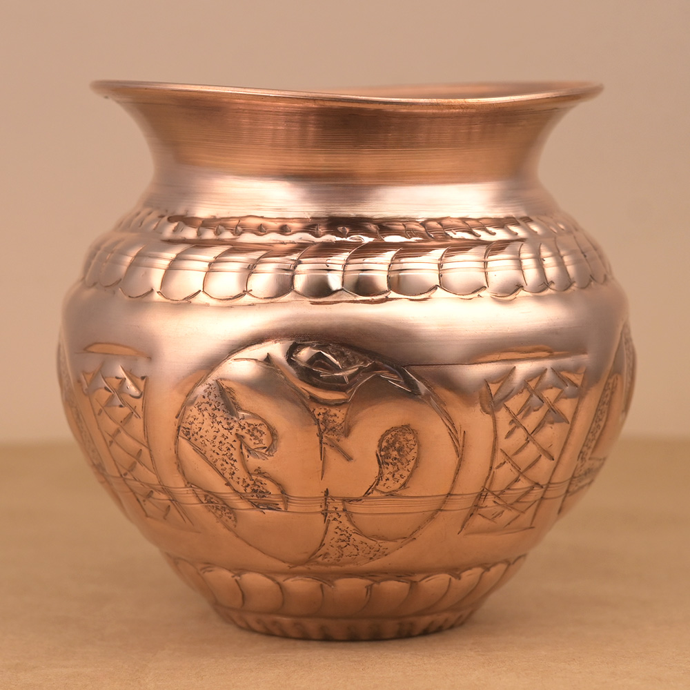 A traditional Kalash made in pure copper with Lord Ganesh carved on one side and the auspicious symbol of "Om" and “Swastika” sign carved on the other side. This kalash is meant to hold water during religious rituals. It may also be placed with due rituals on all important occasions like the traditional house warming (Graha Pravesh), wedding, daily worship and the like, by placing rice/water inside it and mango leaves at the mouth and coconut in the centre of the leaves with a red or white thread around its neck.