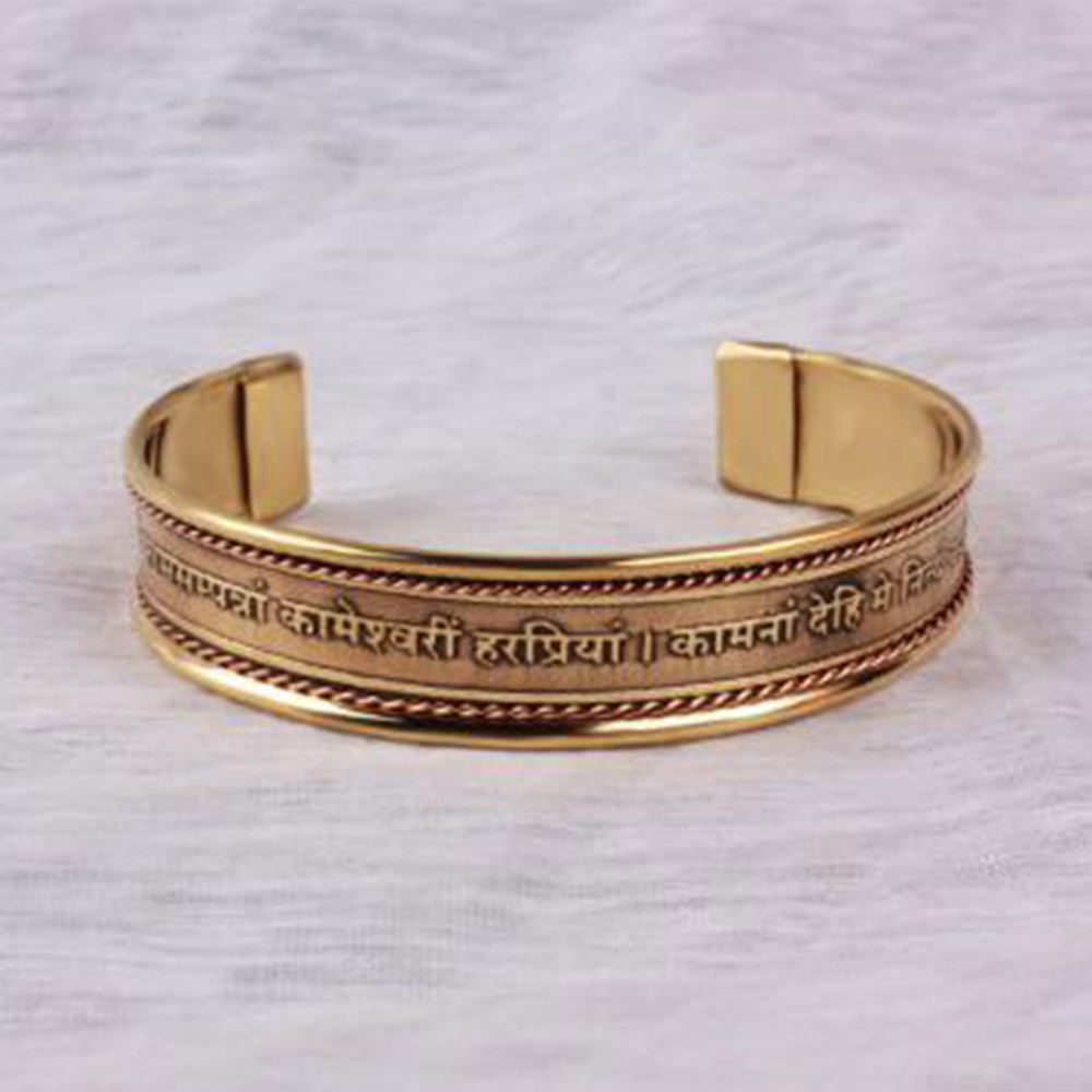 This healing bangle with the inscription Aum Kamakhyam Kamasampannam Kamesvari Harapriyam Kamanam Dehi Me Nityam Kamesvari Namostu te. written in the ancient Indian Sanskrit text which is translated means The renowned source and fulfillment of desire.