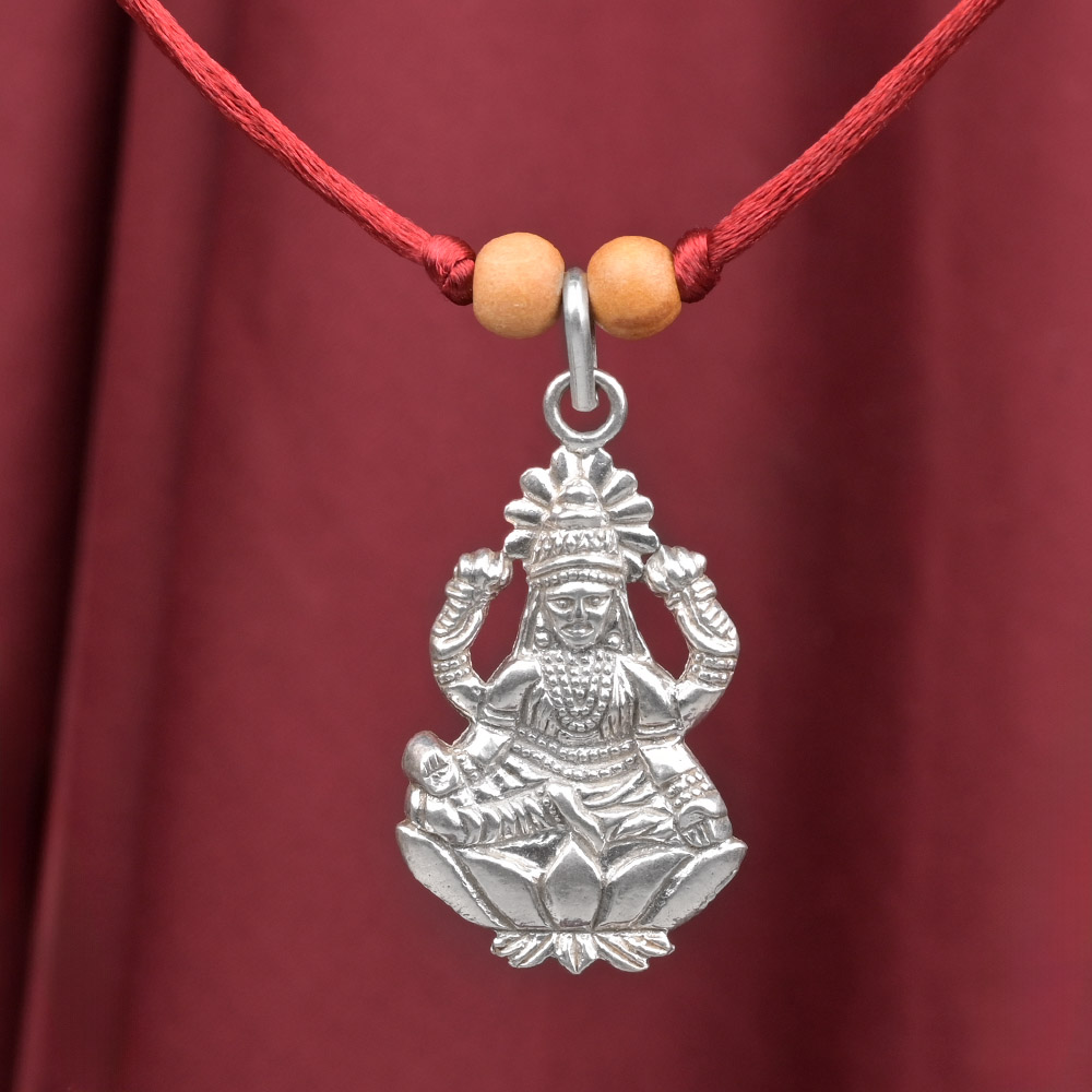 This 925 sterling silver pendant features Maa Lakshmi seated on a blooming lotus, symbolizing prosperity, purity, and divine grace. The intricate detailing highlights her serene expression, adorned crown, and four hands holding symbolic objects, representing wealth, wisdom, and spiritual upliftment.