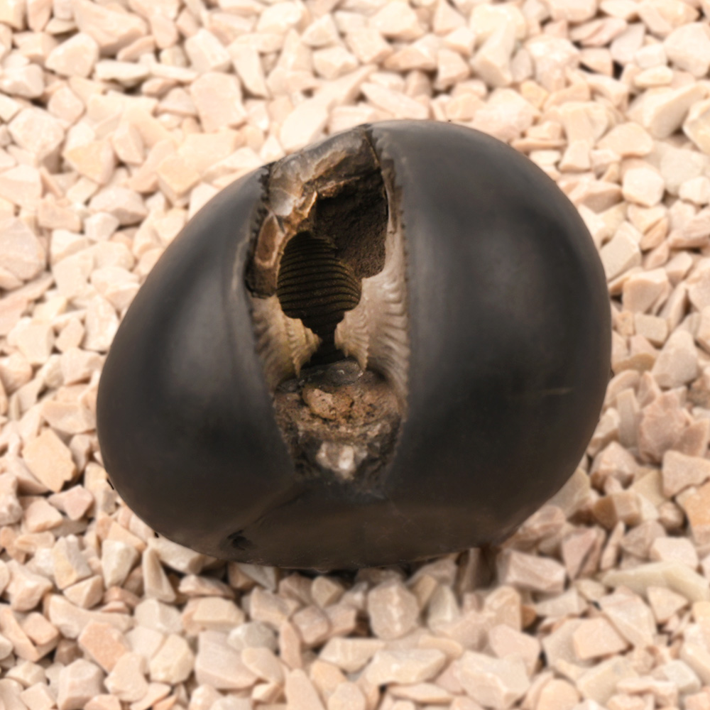 The Laxmi Narayan Shaligram Shila has a unique, rounded shape with a smooth, glossy surface. Its markings are quite distinct, with one side displaying a prominent groove and another subtle indentation. These patterns are symbolic of the divine couple, Lord Vishnu and Goddess Lakshmi. The natural design of this Shaligram resembles the union of both deities, with one side showing the divine presence of Lord Vishnu and the other, Goddess Lakshmi. This Shaligram is easily identifiable due to its visual depiction of prosperity and protection.