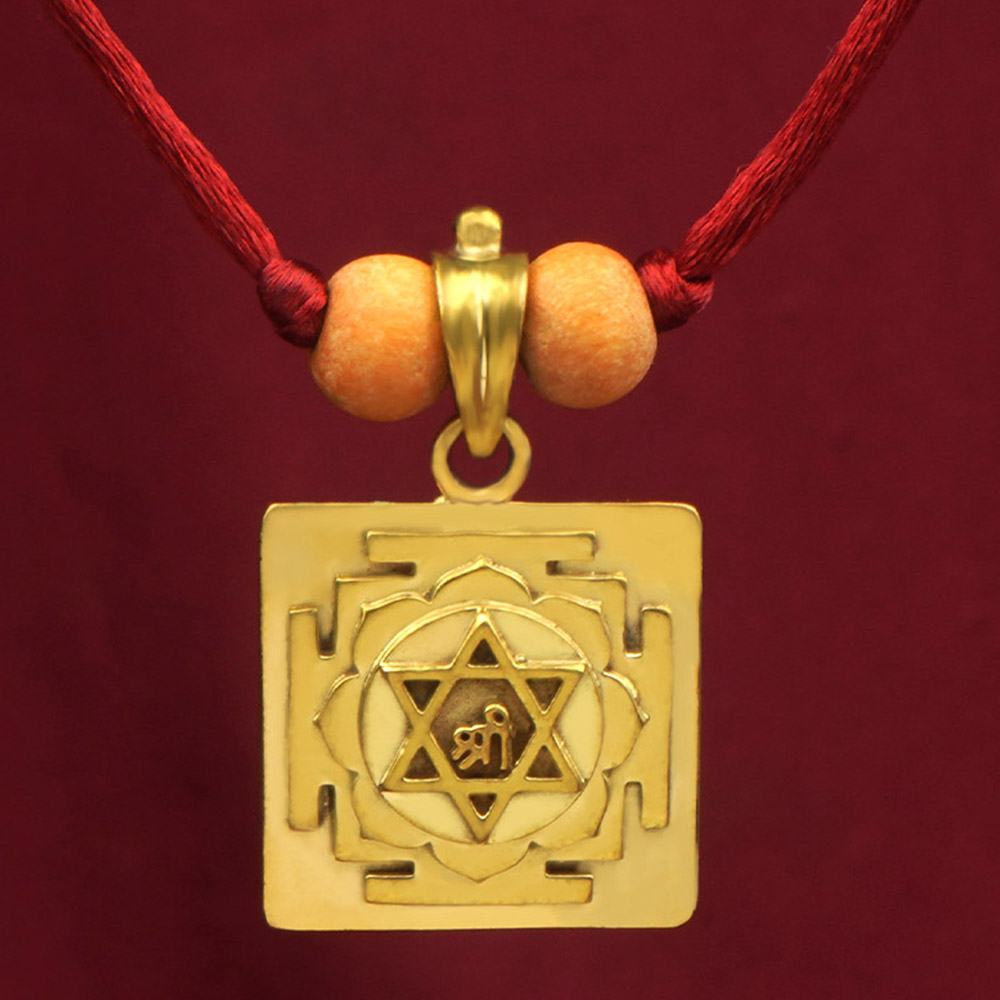 This Kamala 3D Yantra Brass Pendant features a beautifully embossed sacred geometry dedicated to Goddess Kamala—the tantric and most radiant form of Lakshmi, embodying grace, inner beauty, and divine prosperity. Crafted in solid brass by Rudra Centre’s in-house artisans, the pendant is strung on a red macramé cord and adorned with two polished wooden beads, adding a traditional and spiritually vibrant finish.