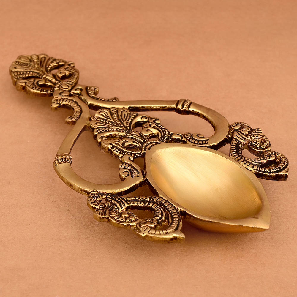 This simple but artistically carved Kapoor Dhoop Aaarti Diya made in Brass serves the purpose of burning Kapoor to perform \'aarti\' as well as makes you feel elevated in energy and mood while offering the aarti because of its sheer elegance.