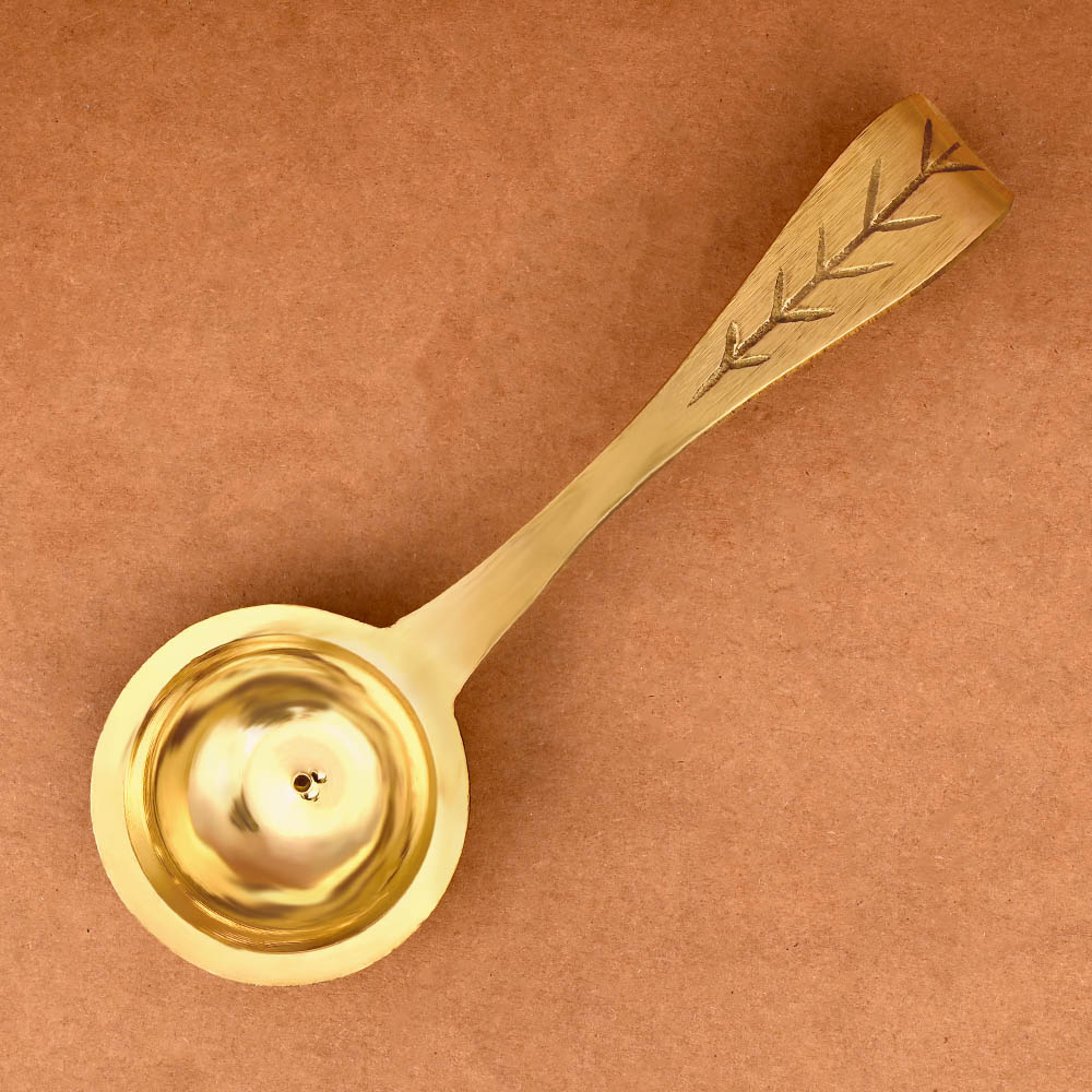 This Aarti spoon crafted from brass is used to light camphor for Aarti of Deity. It\'s the simplicity of design that defines the grace of the spoon. With broad space for placing and lighting Camphor, it makes an ideal choice during grand puja occasions. The long and curved handle avoids the hands from getting heated during puja. The fumes emitted from camphor purify the atmosphere and lessens fears and negativity from mind.