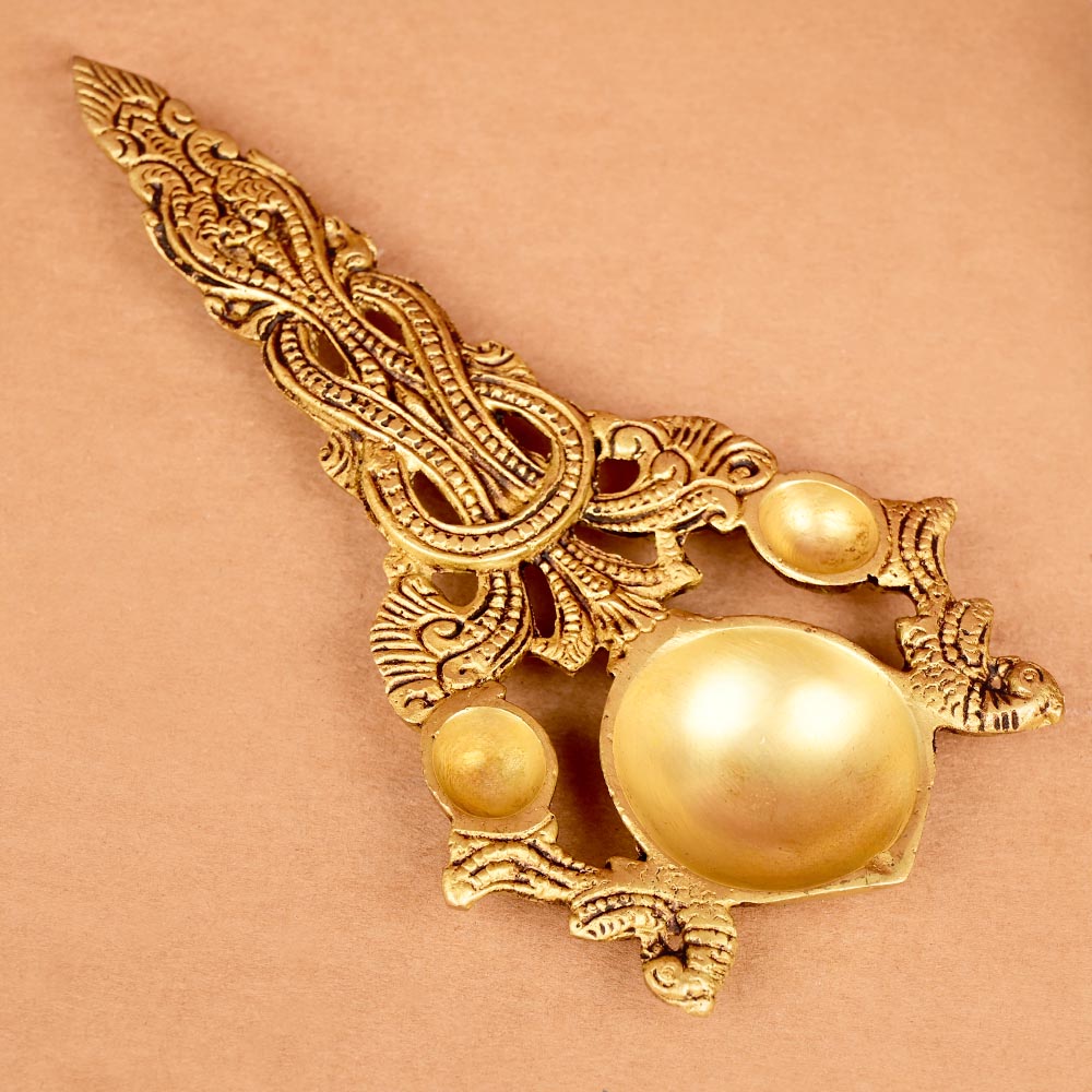 It's the simplicity that defines the grace! This beautiful \'Brass Aarti Diya\' has an artistic handle carved with simplicity keeping in mind the decor, which is to be highlighted with true grace and elegance.