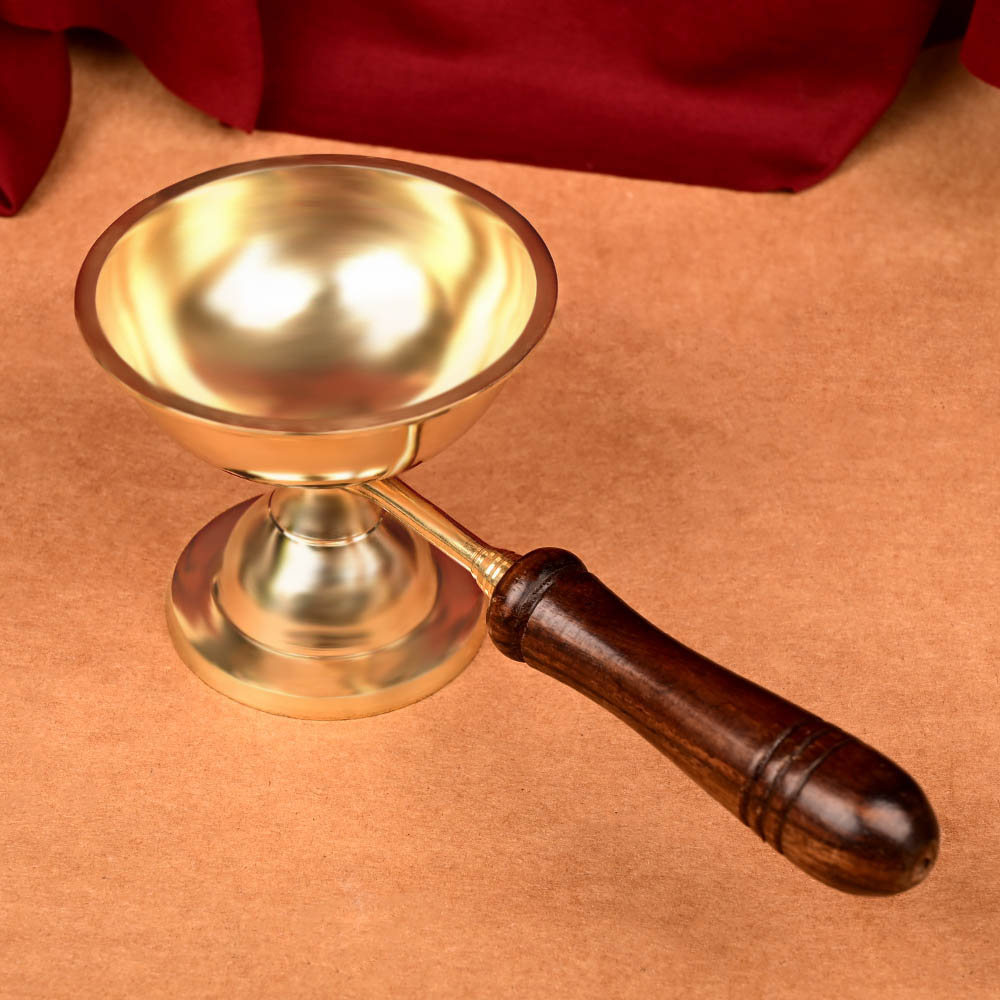A golden camphor lamp with a big circular holder in it for holding camphor/dhoop. It is crafted artistically along with a sturdy wooden handle and base.