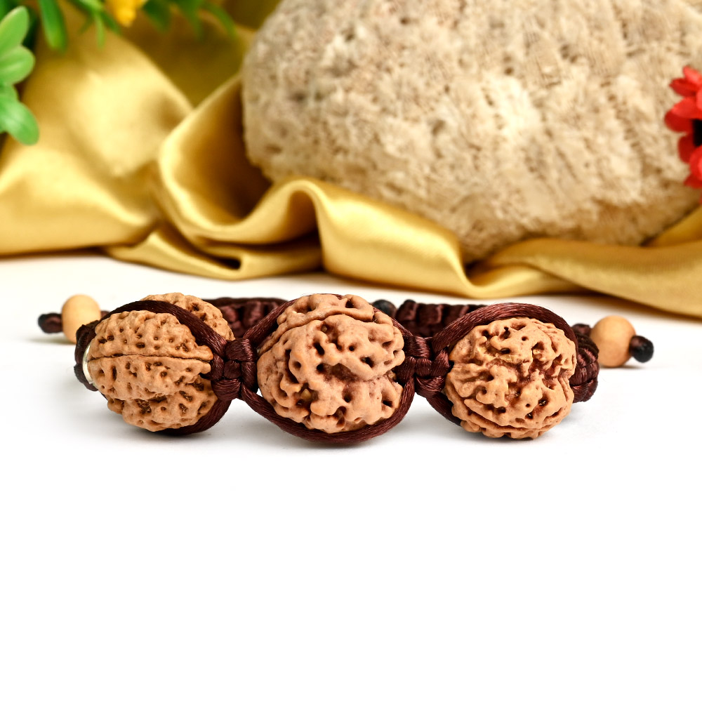 An appealing bracelet of 3 mukhi beads weaved together in a broad band bracelet is an excellent everyday wear accessory which is powerful too. Three mukhi Rudraksha represents "Fire" God Agnidev and planet Sun . Wearing of this Rudraksha frees the person from bondages of his Past birth karma. Wearer is protected from diseases, obstacles and failures. Removal of past birth karma allows the wearer to get all the success he wants in this birth by karma in this birth. It is said that the wearer of 3 mukhi never takes birth again, means he gets Moksha. Read more about 3 mukhi