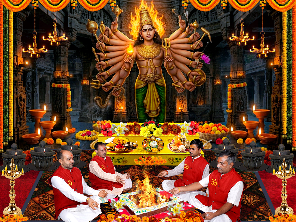 Lord Kartavirya Arjuna was an ardent devotee of Lord Dattatreya. He was the king of the ancient Haihayas kingdom, which was on the banks of Narmada River in the current state of Madhya Pradesh in the Treta Yuga. As per Puranas, Lord Kartavirya Arjuna was manifestation of the Sudarshana Chakra of Lord Vishnu. Lord Kartavirya Arjuna has mention in numerous ancient Vedic scriptures including the oldest of them all, the Rig Veda. He did hard penance of Lord Dattatreya for 10,000 years and accumulated numerous boons and blessings. One of the boons he received was that of 1000 powerful human arms which may appear and disappear at his will. Thus he is also known by the names Sahasrabahu Arjuna or Sahasrarjuna. As per scriptures by worshipping Lord Kartavirya Arjuna one may regain lost wealth. Thus Lord Kartavirya Arjuna Puja and Havan is considered as the best remedy to regain money or possessions which have been stolen, misplaced or lost. In this powerful Puja and Havan, Lord Kartavirya Arjuna is invoked and worshipped through Puja, Mantra Japa, Kartavirya Arjun Stotra recitation and other rituals.