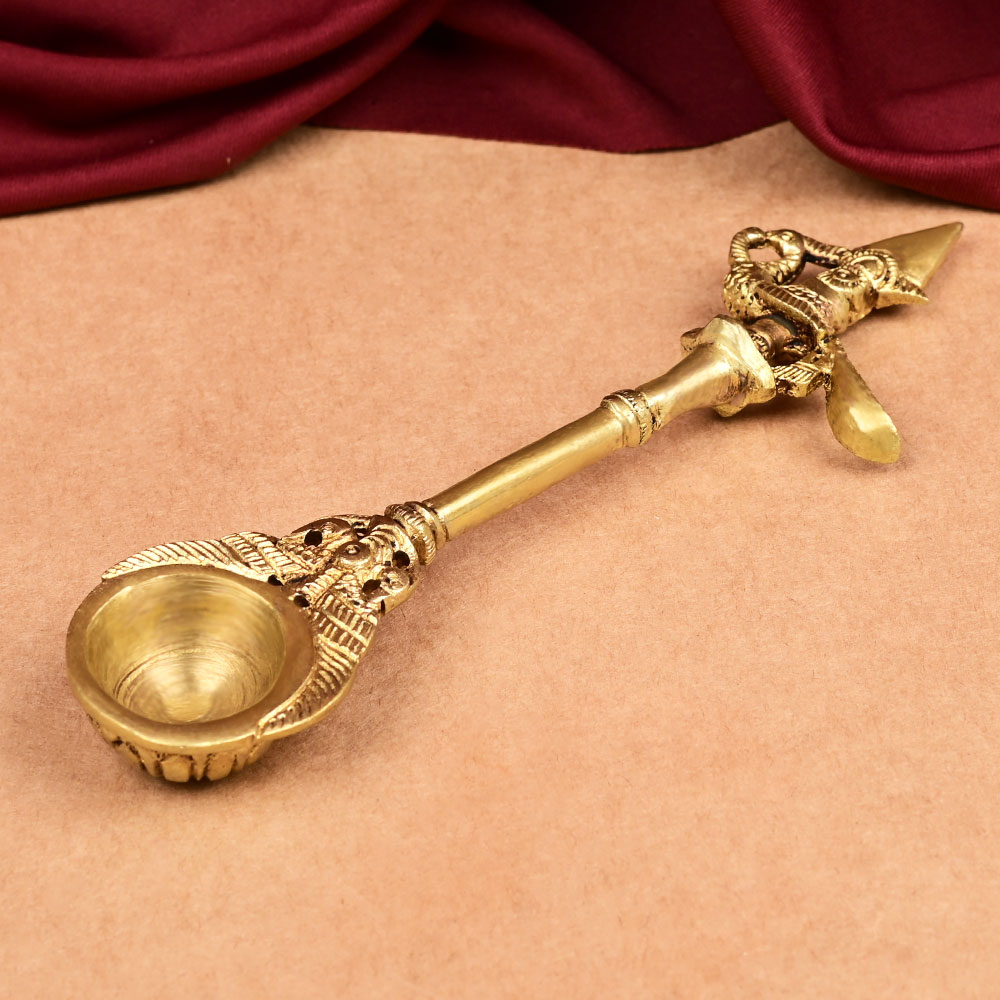 A beautifully antique designed spoon in Brass has the vehicle of Lord Kartikeya, the Peacock and His weapon, the spear one side and two peacocks at the bottom.
