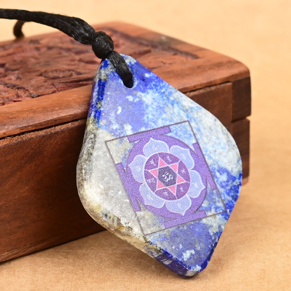 Vibrant pendant with Sacred Katyayani Yantra printed on natural Lapis Lazuli gemstone. The coloured Yantra image made of UV print is washable and long-lasting. Lapis Lazuli gemstone has properties of providing self-awareness, compassion, creativity, and clarity. The combination of Katyayani Yantra and Lapis Lazuli provides success in finding love and suitable match and harmonious and fruitful martial life.