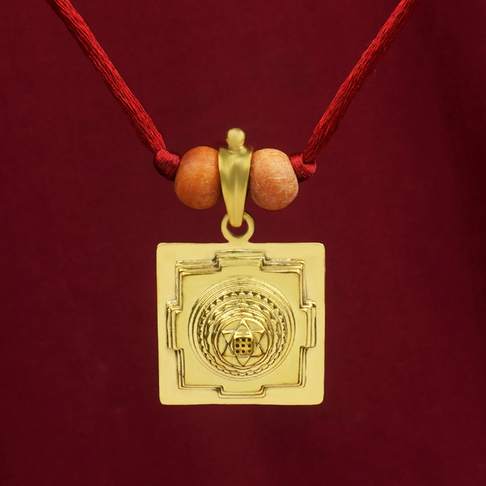 This Kuber 3D Yantra Brass Pendant features a finely raised and detailed 3D depiction of the sacred Kuber Yantra, symbolizing divine abundance and material prosperity. Expertly handcrafted in solid brass by Rudra Centre’s in-house artisans, the pendant is strung on a vibrant red macramé cord and accented with two smooth wooden beads, blending traditional design with spiritual significance.