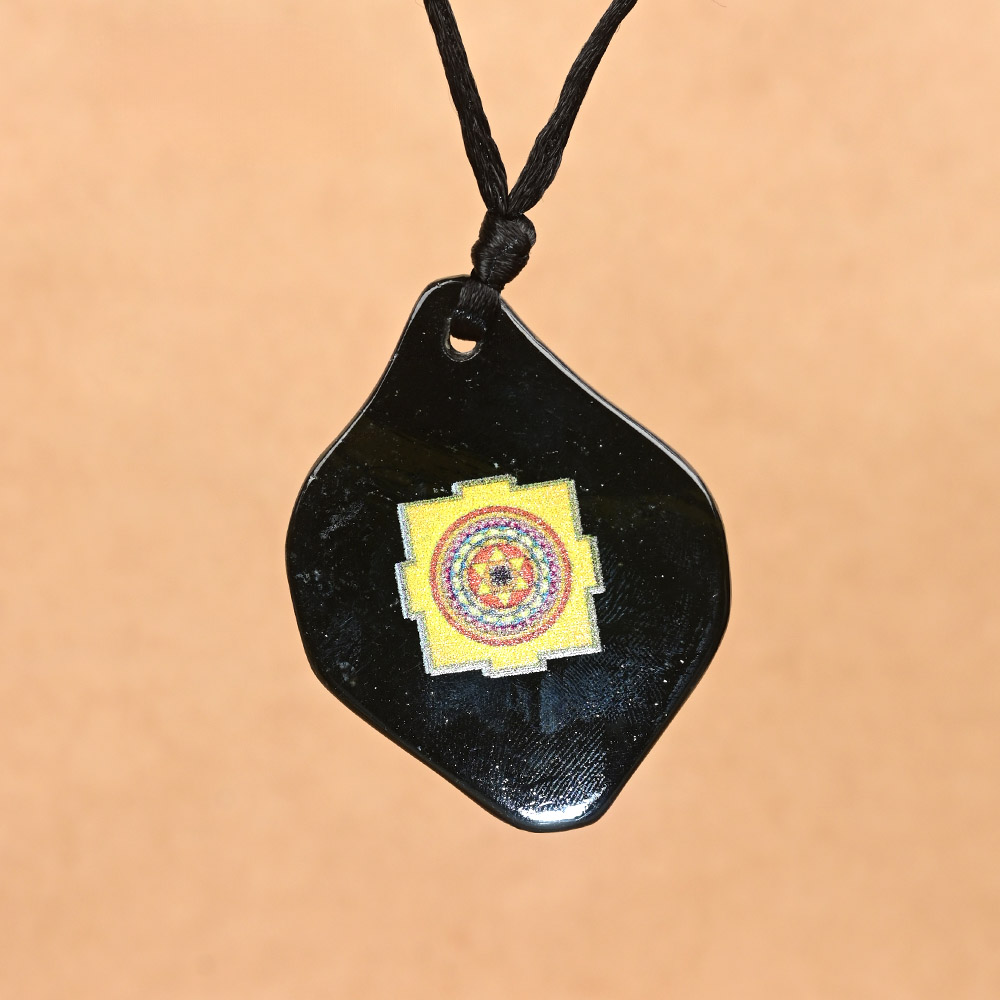 Gorgeous pendant with coloured Kuber Yantra printed on sleek Black Jade gemstone. The enticing UV print and smooth edging makes this pendant a comfortable pendant to wear. The combination of Kuber Yantra and Black Jade provides motivation, confidence, stability, prosperity, good luck, riches and materialistic wealth. It also helps dispel negative emotions like fear, doubt and anxiety.