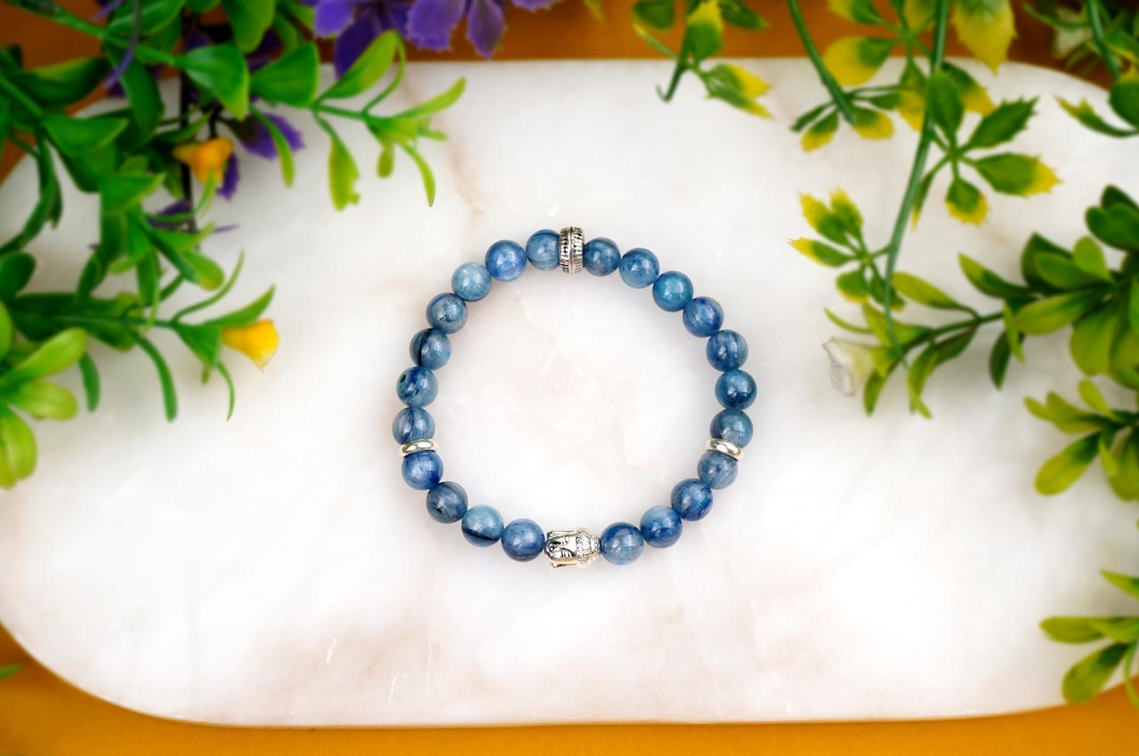 The kyanite beads are complemented by smooth silver spacers positioned between select beads, enhancing the overall elegance and giving the bracelet a refined look. The combination of the serene blue kyanite, silver spacers, and the symbolic Buddha charm makes this bracelet not only a stylish accessory but also a source of tranquility and balance, perfect for those seeking a spiritually meaningful adornment. The elastic band ensures an easy and adjustable fit, suitable for any wrist size.
