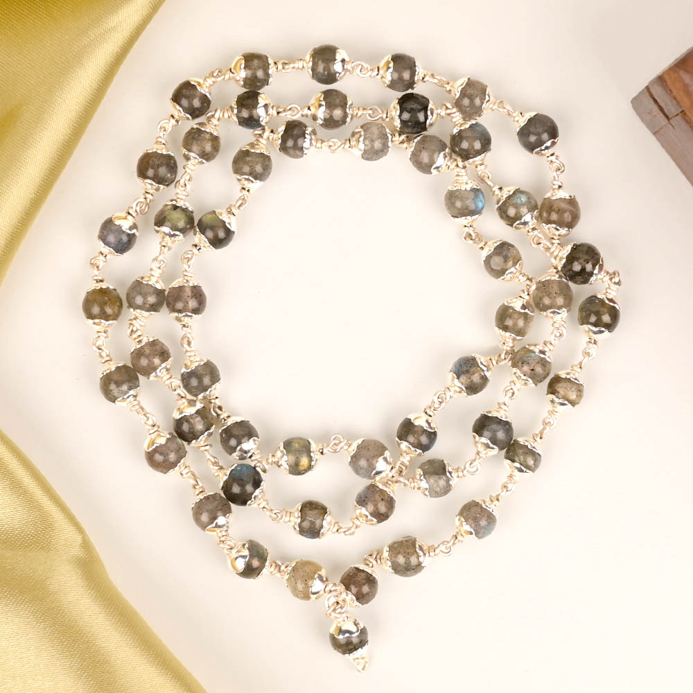 Labradorite is known as a stone of transformation, intuition, and protection. It awakens higher consciousness, strengthens spiritual connection, and acts as a shield against negativity. Wearing Labradorite enhances creativity, boosts mental clarity, and inspires perseverance, making it an ideal companion for those seeking balance and inspiration in life. The 925 silver flower caps further magnify the mala’s purity, as silver is believed to channel positive energy and promote calmness. Together, the shimmering Labradorite beads and sterling silver accents create a mala that symbolizes protection, clarity, and spiritual growth.