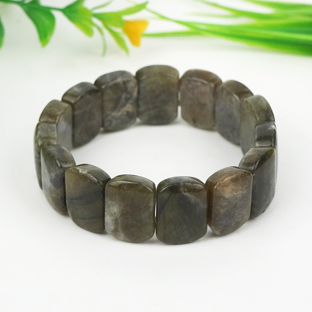 This Labradorite bracelet features rectangular beads with a smooth, polished surface, arranged in a stretchable design for a comfortable fit. The beads display a mix of dark grey and earthy brown tones with flashes of iridescent blue and green when viewed from different angles. Known for enhancing intuition, this bracelet helps protect against negative energies, strengthens inner vision, and supports transformation during times of change.