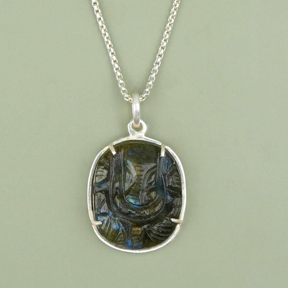 This Natural Labradorite Ganesh locket features a finely carved idol of Lord Ganesha, the remover of obstacles and harbinger of wisdom, carved on a natural labradorite gemstone, set in a sleek 925 silver setting and hung on a pure silver chain. The labradorite displays flashes of blue and grey, giving the pendant a mystical and elegant look, while the attached silver chain complements it with simplicity. The chain is secured with a lobster clasp and comes with adjustable hooks for a comfortable fit. Known for its spiritual significance, this locket helps enhance intuition and inner guidance, offers divine blessings for wisdom and success, and protects the wearer from negative energies.