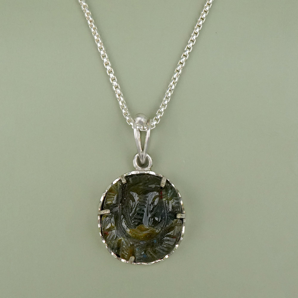 This Natural Labradorite Ganesh locket features a finely carved idol of Lord Ganesha, the remover of obstacles and harbinger of wisdom, carved on a natural labradorite gemstone, set in a sleek 925 silver setting and hung on a pure silver chain. The labradorite displays flashes of blue and grey, giving the pendant a mystical and elegant look, while the attached silver chain complements it with simplicity. The chain is secured with a lobster clasp and comes with adjustable hooks for a comfortable fit. Known for its spiritual significance, this locket helps enhance intuition and inner guidance, offers divine blessings for wisdom and success, and protects the wearer from negative energies.