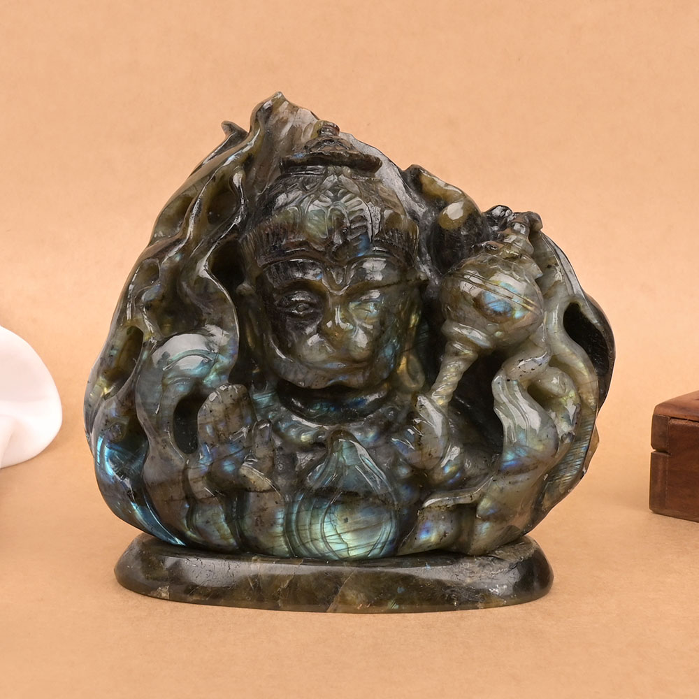 This finely carved idol depicts Lord Hanuman, the embodiment of strength, devotion, and divine service, in a majestic form sculpted from natural Labradorite stone. Hanuman is shown in a serene yet powerful expression, his eyes half-closed in meditative focus.