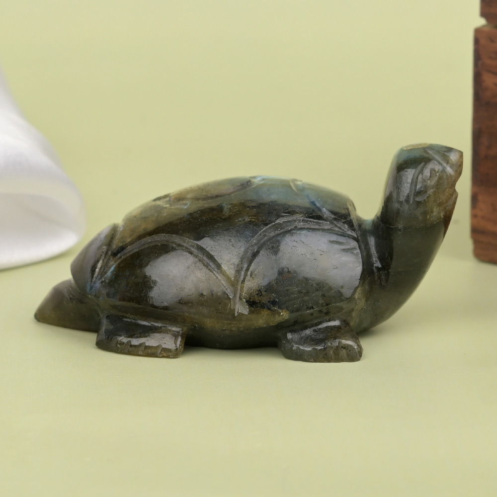 This Kurma (the tortoise avatar form of Lord Vishnu) is sculpted in natural Labradorite gemstone. Kurma is a symbol of steadiness, longevity, reliability, and support. Kurma in Labradorite helps lead one to his/her spiritual destiny and promote clarity of thoughts and enhances wisdom. It helps dispels fear and insecurities and promotes faith and trust in self and Universe. You can install this Kurma on your office table or work desk or in the living room with the mouth of the Kurma facing the West direction.