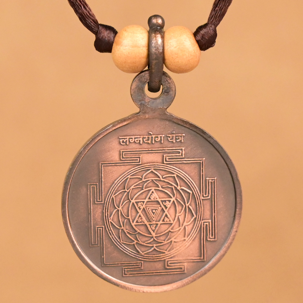This magnificent locket with Lagna Yog Yantra etched on front side and image of wedding couple on reverse side is made in fine antique finish copper. This Yantra is suitable for those who are facing delays and hurdles in getting married due any karmic blockages.