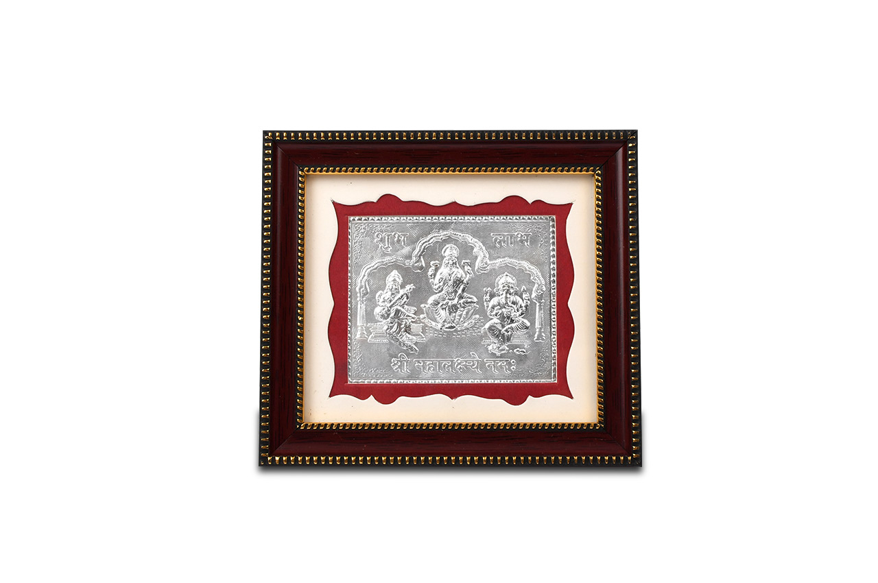 Lakshmi Ganesh Saraswati exquisitely portrayed in pure silver and framed elegantly.