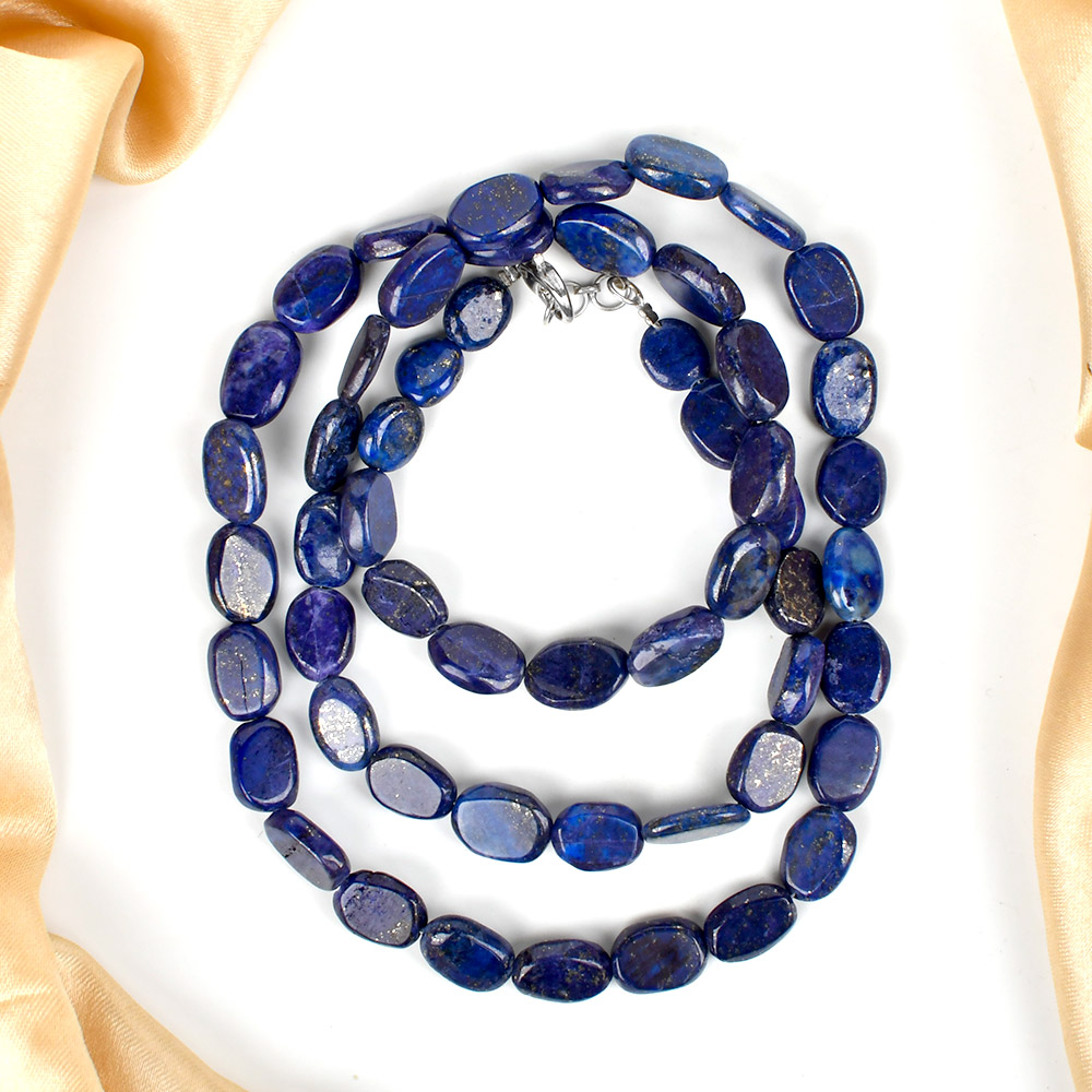This elegant necklace is crafted from natural Lapis Lazuli flat oval beads, each polished to a smooth, lustrous finish that highlights the stone’s deep royal blue hue. The beads are interspersed with natural golden pyrite flecks, giving the necklace a celestial appearance reminiscent of a starry night sky. The uniform arrangement of the oval beads creates a refined, balanced look, while the secure clasp ensures comfortable and confident wear. Lapis Lazuli has been treasured since ancient times as a stone of wisdom, truth, and spiritual insight. In Vedic tradition, it is associated with activating the Throat Chakra and Third Eye Chakra, enhancing communication, self-expression, and inner vision. Wearing this necklace is believed to stimulate clarity of thought, expand awareness, and strengthen one’s connection to higher knowledge. It is also considered a protective stone, shielding the aura from negativity and fostering harmony in relationships. This Lapis Lazuli necklace is ideal for both spiritual practice and sophisticated daily adornment.