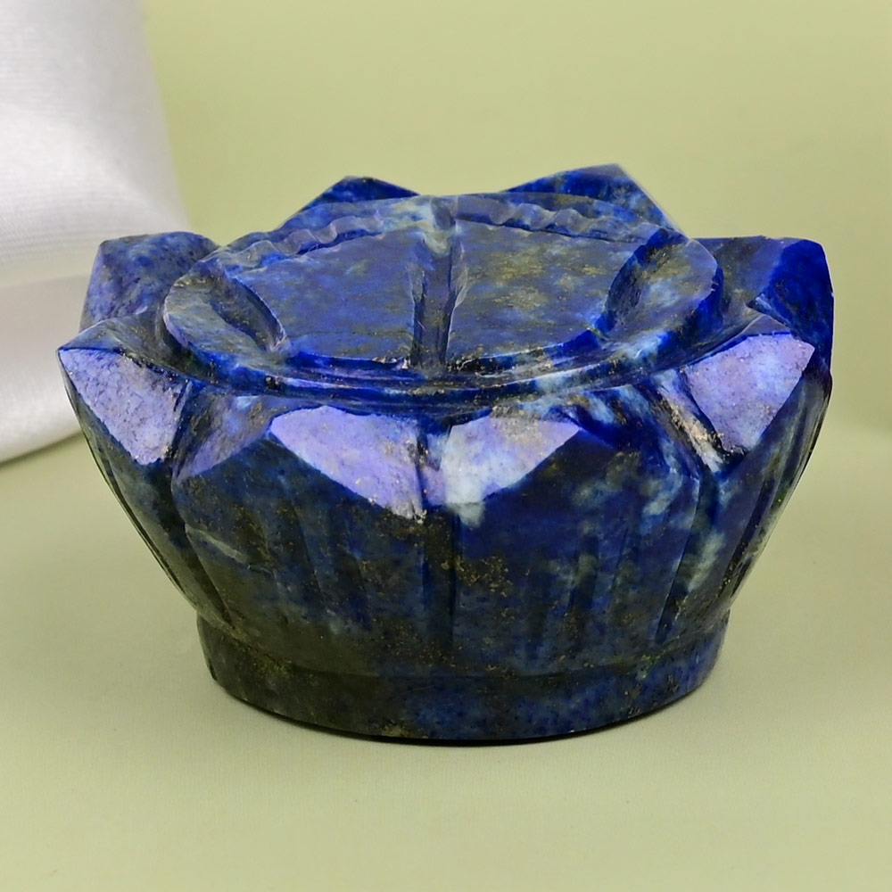 Maa Laxmi feet carry 15 auspicious symbols, which restored prosperity and opulence in heaven. In this figurine, Maa Laxmi feet are carved on an Astadal Lotus (8 petal Lotus) made in natural Lapis Lazuli gemstone. Placing it at home/office/place of business bestows fortune, wealth, growth, wellbeing and harmony and dispels all kinds of money related problems. Lapis Lazuli promotes energies of awareness, perfectionism, opulence, and clarity and helps establish a spiritual connection with Maa Laxmi.