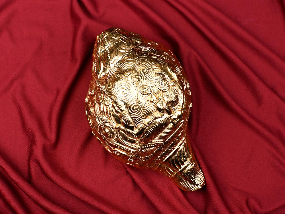 This natural shankh is intricately gold-plated on the outside and features detailed embossing of Goddess Laxmi and Lord Narayan surrounded by ornamental patterns. The inner surface retains its natural conch texture in smooth white, while the mouthpiece is designed for both display and ritual use. The body is richly carved with divine motifs, making it a sacred and decorative item for your altar. The gold plating is thick and highly durable.