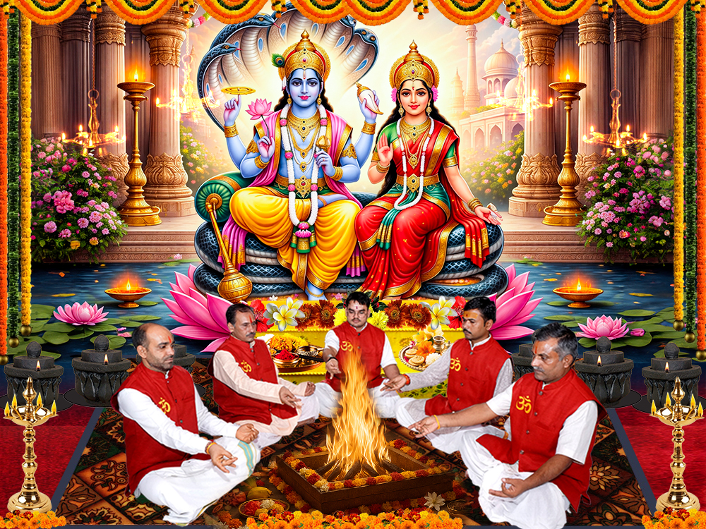 Lakshmi Narayan Maha Anusthaan – 9 Kunda Homa is a highly sacred and powerful Vedic ritual performed for wealth, prosperity, stability, protection, and overall life harmony. The primary Deities worshipped in this Anusthaan are Goddess Mahalaxmi, the bestower of wealth and abundance, and Lord Narayan, the sustainer and protector of the universe.