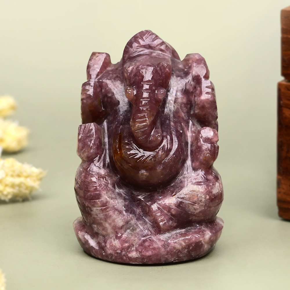 The beautiful Lord Ganesha idol in seated position is carved from natural Lepidolite stone. Lord Ganesha is remover of obstacles; He is the God of wisdom and knowledge and is worshipped before undertaking of any endeavor. Both Lord Ganesha and the Lepidolite are providers of good fortune. The amazing Lord Ganesha idol in Lepidolite provides dual benefits of blessing of Lord Ganesha and benefits of the Lepidolite gemstone which are releasing of stress, enhancement of mental peace and promotion of restful sleep.