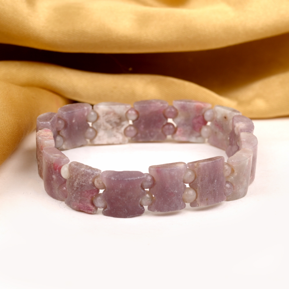 This Lepidolite Bracelet features a unique combination of square-shaped beads paired with small round accents, showcasing soft lilac and pinkish-purple tones with natural variations. The blend of shapes creates a distinctive and modern design while maintaining a gentle, elegant look.
